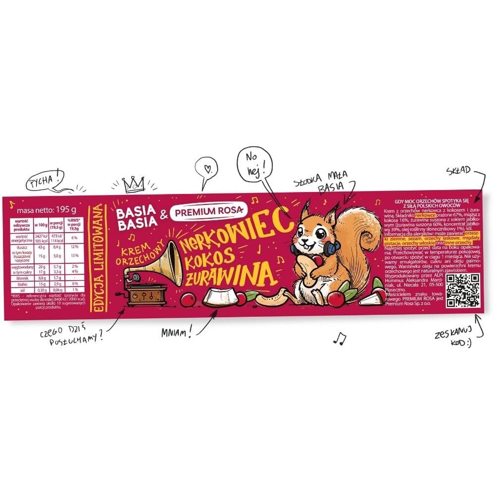 Alpi BasiaBasia & Premium Rosa Cashew Coconut Cranberry Nut Butter es una crema para untar natural con un 67% de anacardos tostados , enriquecida con pulpa de coco y arándanos secos .