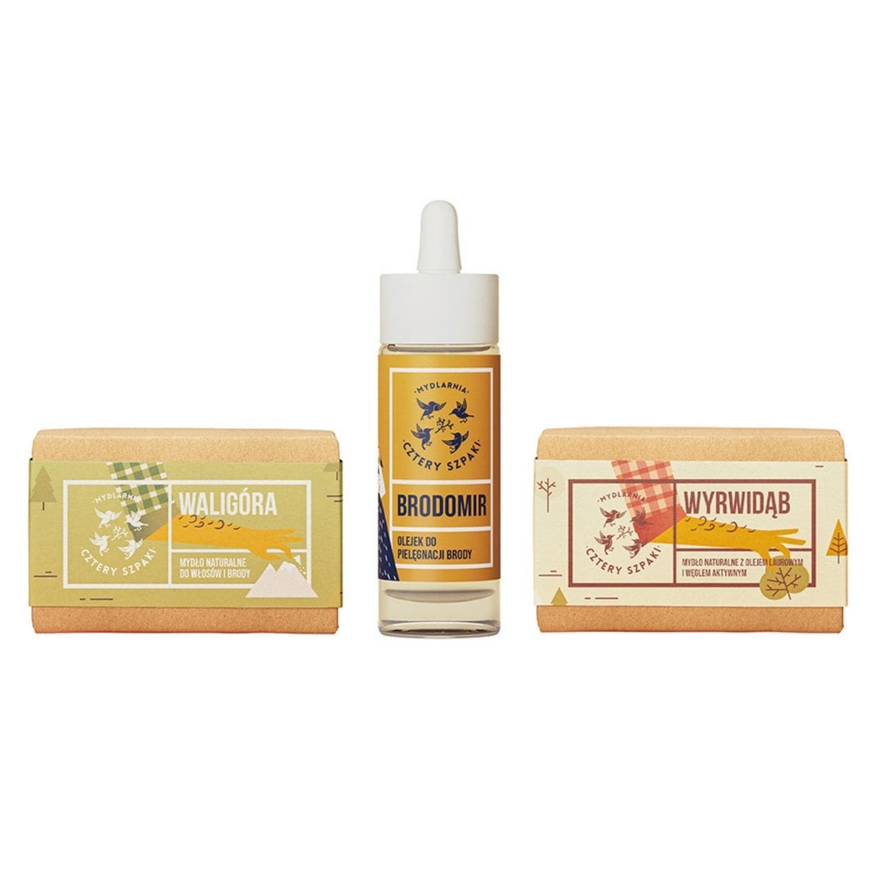 La filosofía detrás del conjunto es la simplicidad y la eficacia sin concesiones. Sin ingredientes innecesarios, fragancias artificiales ni colorantes: solo cosméticos veganos puros y naturales que funcionan. El aceite Brodomir suaviza y nutre el vello facial, el jabón Waligóra limpia la barba sin eliminar sus aceites naturales y Wyrwidąb con carbón vegetal limpia en profundidad la piel de todo el cuerpo. Este es un cuidado que todo hombre apreciará.