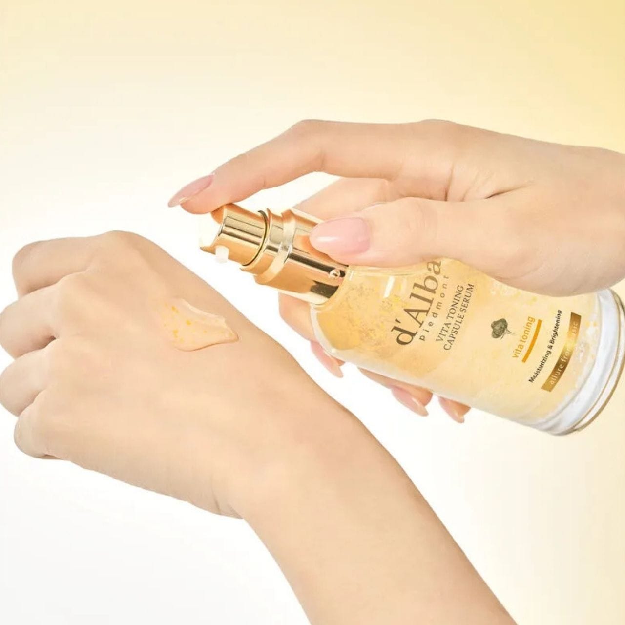 Serum D'Alba Vita Toning con fórmula innovadora a base de agua pura de espino amarillo que proporciona a la piel la energía natural de las vitaminas. Las exclusivas 40,000 cápsulas de vitaminas que se liberan durante la aplicación proporcionan una nutrición intensiva y un efecto iluminador inmediato. El avanzado complejo Vitality combina ingredientes activos hidratantes, regeneradores y antienvejecimiento que actúan de forma sinérgica desde el interior.