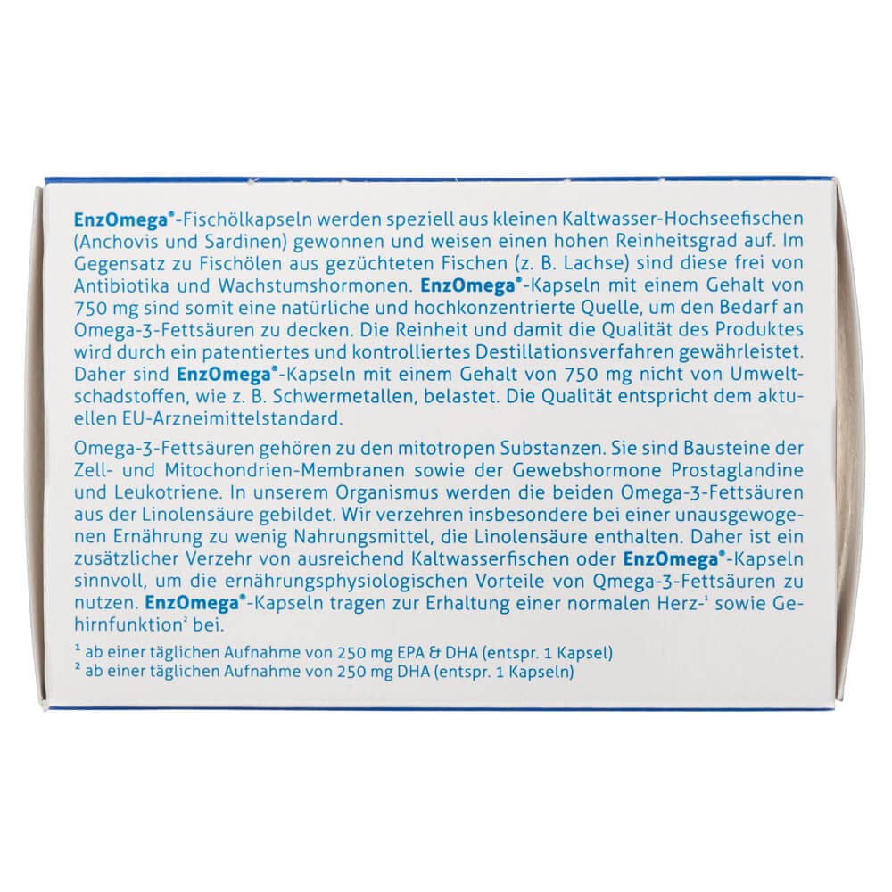 EnzOmega ® MSE de Dr.Enzmann es un suplemento dietético en cápsulas que contiene ácidos grasos Omega 3 en altas proporciones de DHA 220 mg y EPA 530 mg. La proporción ideal (2:1) de los importantes ácidos grasos omega 3 EPA y DHA garantiza el equilibrio bioquímico y la máxima eficacia del producto, apoyando así eficazmente la función, cardíaca, la función, cerebral y una visión adecuada.