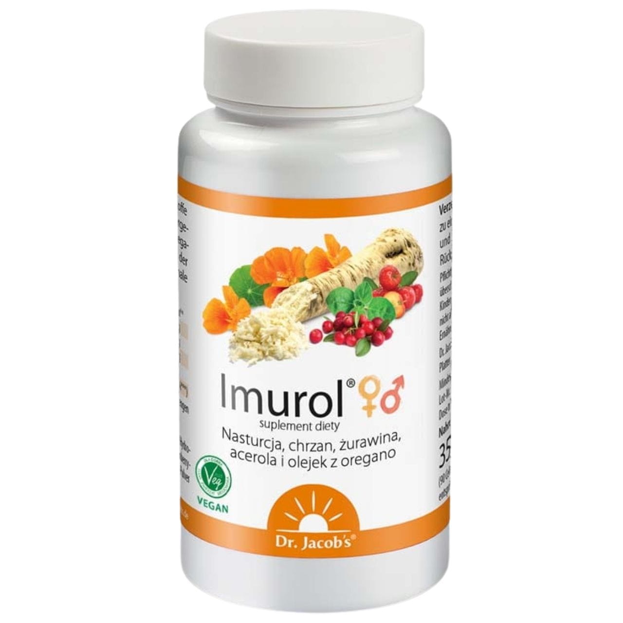 Dr. Jacob's Imurol es un complemento alimenticio en cápsulas veganas que contiene polvo de capuchina, rábano picante en polvo, extracto de arándano rojo, aceite de orégano y extracto de cereza acerola como fuente de vitamina C (40 mg — 50 % de la CDR) por dosis diaria (3 cápsulas). La vitamina C contribuye al funcionamiento normal del sistema inmunitario y protege las células del estrés oxidativo. El producto es vegano y sin gluten. Información nutricional: