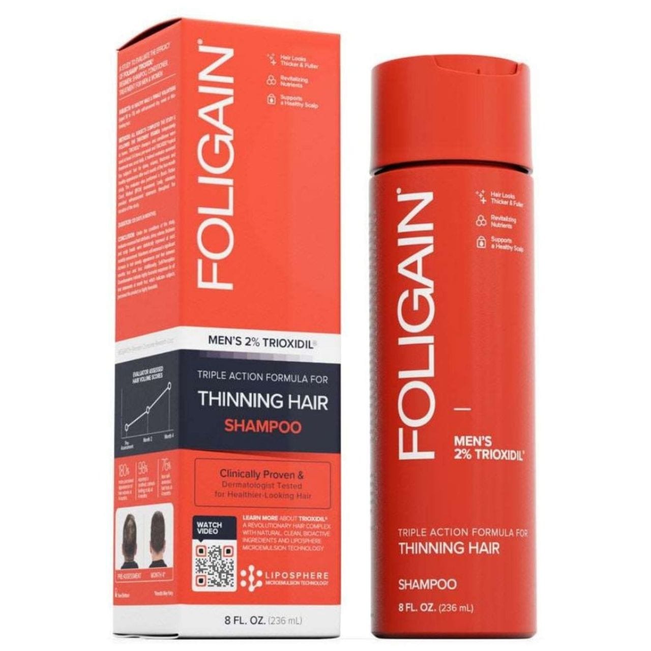 El champú FOLIGAIN con un 2% de Trioxidil es una fórmula clínicamente probada para hombres con cabello fino. Contiene el complejo patentado Trioxidil , que según estudios aumenta el volumen del cabello en un 180% en 4 meses y reduce la caída del cabello en un 76% . Bloquea la DHT, limpia el cuero cabelludo y fortalece los folículos pilosos. ¡Sin parabenos, sulfatos ni ftalatos !