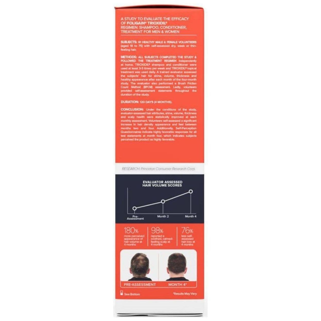 El champú FOLIGAIN representa los últimos avances en la lucha contra la alopecia androgenética . El ingrediente clave es el complejo patentado Trioxidil ® en una concentración del 2%, cuya eficacia ha sido confirmada en rigurosos ensayos clínicos. Los resultados son impresionantes: Aumento del 180% en el volumen del cabello después de 4 meses, Reducción del 76% en la caída del cabello durante el mismo periodo, y Mejora del 75% en la densidad después de solo 2 meses de uso.