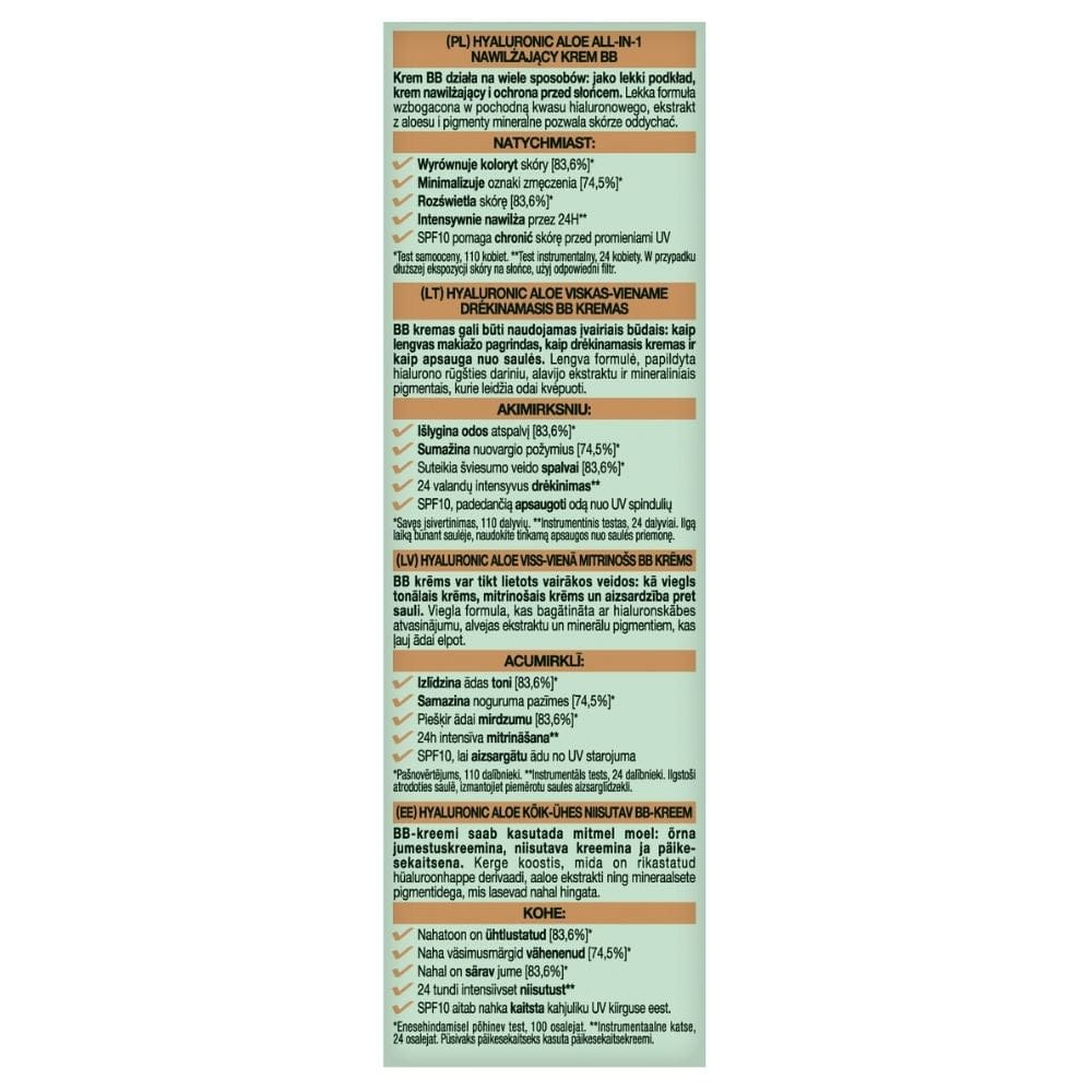 Garnier BB Cream es un producto multifuncional que combina las propiedades de una base de maquillaje ligera, hidratante y protección solar. Su fórmula ligera, enriquecida con un derivado del ácido hialurónico, extracto de aloe vera y pigmentos minerales, permite que la piel respire y es adecuada para todo tipo de pieles. La BB cream unifica al instante el tono de la piel, minimiza los signos de fatiga, ilumina el cutis y hidrata intensamente durante 24 horas a la vez que proporciona protección SPF10 .