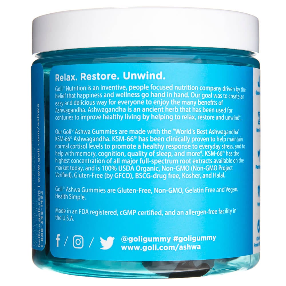 Ashwagandha de Goli Nutrition es un complemento alimenticio en forma de gominolas con sabor a frutos del bosque que contiene extracto de raíz de Ashwagandha KSM-66 ®. La fórmula también está enriquecida con vitamina D2.