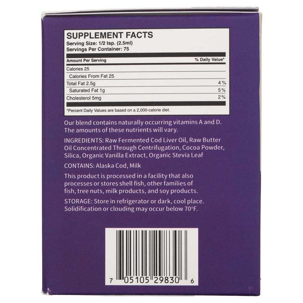RAW Aceite de hígado de bacalao fermentado, RAW Aceite de mantequilla concentrado por centrifugación, Cacao en polvo, Extracto de vainilla orgánica, Sílice, Hoja de estevia orgánica.