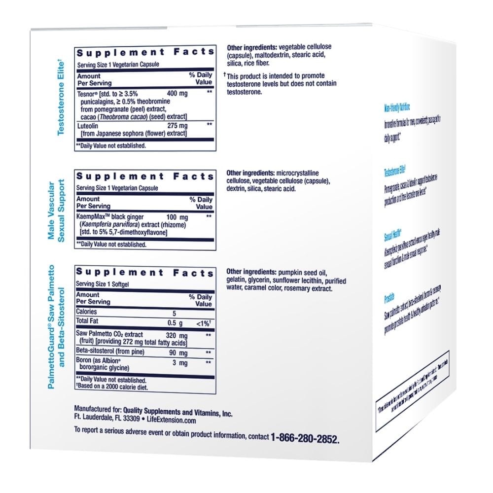 Apoyo diario a la salud adaptado a los hombres: Men's Vitality Packs combinan tres fórmulas para la salud sexual masculina, niveles saludables de testosterona libre y total, y salud prostática y urinaria. Life Extension Men's Vitality Pack es un suplemento dietético disponible en cómodos sobres de cápsulas.