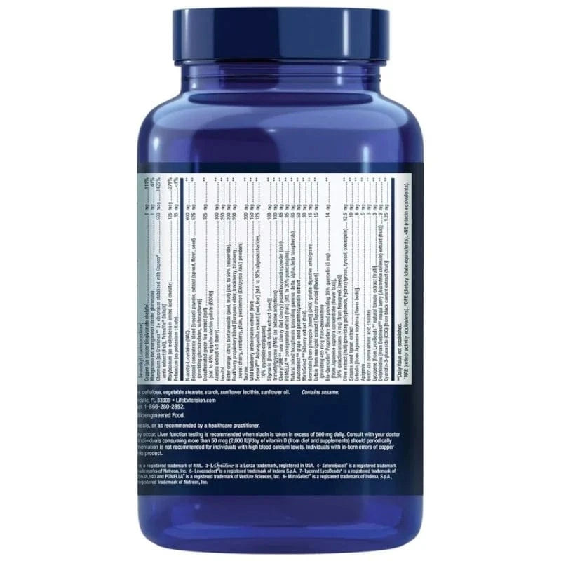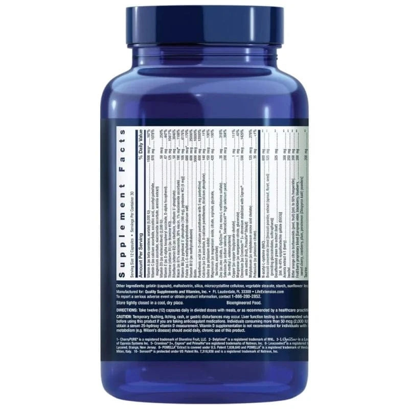 Vitamina A (como beta-caroteno, acetato) (5000 IU), Vitamina C (como ascorbato de calcio, ácido ascórbico, palmitato de ascorbilo, ascorbato de magnesio, ascorbato de niacinamida, extracto de acerola), Vitamina D3 (como colecalciferol) (2000 UI), Vitamina E (como succinato de D-alfa tocoferil, D-alfa tocoferol), Tiamina (vitamina B1) (como clorhidrato de tiamina), Riboflavina (vitamina B2) (como riboflavina, Riboflavina 5'-fosfato), Vitamina B6 [como piridoxal 5'-fosfato (100 mg), piridoxina HCI (5 mg) ], Folato (como sal cálcica de L-5-metiltetrahidrofolato), Vitamina B12 (como metilcobalamina), Biotina, Ácido pantoténico (como D-pantotenato cálcico con 5 mg de pantetina), Calcio (como ascorbato cálcico, D-pantotenato, fosfato dicálcico), Yodo (como yoduro potásico), Magnesio (como óxido de magnesio, citrato, arginato, glicinato, taurato, ascorbato), Zinc (como citrato de zinc, L-OptiZinc ® 3 sulfato de zinc mono-L-metionina), Selenio [como selenito de sodio, SelenoExcell ® 4 levadura con alto contenido en selenio, Se-metil-L-selenocisteína], Cobre [como quelato de bisglicinato de cobre], Manganeso (como citrato de manganeso, gluconato de manganeso), Cromo [como Crominex ® 5 3+ cromo estabilizado con Capros ® extracto de amla (fruta), PrimaVie ® Shilajit], Molibdeno (como quelato de aminoácido de molibdeno), Potasio (como citrato de potasio), Mezcla de concentrado de brócoli [brócoli polvo, extracto (brotes, inflorescencias, semillas) (aportando glucosinolatos, sulforafano) ], N-acetil-L-cisteína (NAC), Extracto descafeinado de té verde (hoja) [std. hasta 45% epigalocatequina galato (EGCG) ], Extracto de acerola 4:1 (bayas), Inositol, Bioflavonoides cítricos de naranja amarga (cáscara, fruto) [std. hasta 50% hesperidina], Mezcla patentada de frutas y bayas [baya del saúco, mora, arándano, cereza, arándano rojo, ciruela, caqui (Diospyros kaki) polvo], Taurina, Extracto de antocianina de arándano silvestre (fruto), Sensoril ® 10 Extracto de Ashwagandha (raíz, hoja) [std. hasta 32% de oligosacáridos,10% de conjugados glicosídicos], Silimarina [de extracto de cardo mariano (semilla) ], Trimetilglicina (TMG) (como betaína anhidra), CherryPure ® 1 extracto de proantocianidinas (cáscara), POMELLA ® 8 extracto de granada (fruto) [std. hasta 30% punicalaginas], Tocoferoles mixtos naturales (que aportan tocoferoles gamma, delta, alfa, beta), MirtoSelect ® 9 Extracto de arándanos (fruto), Leucoselect ® 6 Extracto de proantocianidinas de semilla de uva, Bio-Quercetina ® Mezcla patentada que proporciona 35% de quercetina (5 mg) [de concentrado de sophora japonesa (capullo de flor) ],30% de galactomananos (4 mg) [de semilla de fenogreco () ] 15 mg, Bromelina [de piña (tallo) ] (2400 unidades digestivas de gelatina/gramo), Luteína [de extracto de caléndula (flor) ] (que aporta 465 mcg trans-zeaxantina), Extracto de aceituna (fruto) (que proporciona polifenoles, hidroxitirosol, tirosol, oleuropeína), Extracto de lignanos de semillas de sésamo, Luteolina [de brotes florales de sofora japonesa () ], Apigenina, Boro (como quelato aminoácido de boro), Licopeno [de LycoBeads ® 7 extracto natural de tomate (fruta) ], Delfinidina [de Delphinol ® 2 extracto de bayas de maqui (Aristotelia chilensis) (fruta) ], Cianidina 3-glucósido (C3G) [de extracto de grosella negra (fruta) ], Gelatina (cápsula), Agentes de relleno: maltodextrina, sílice, celulosa microcristalina, estearato vegetal, almidón, lecitina de girasol, aceite de girasol.