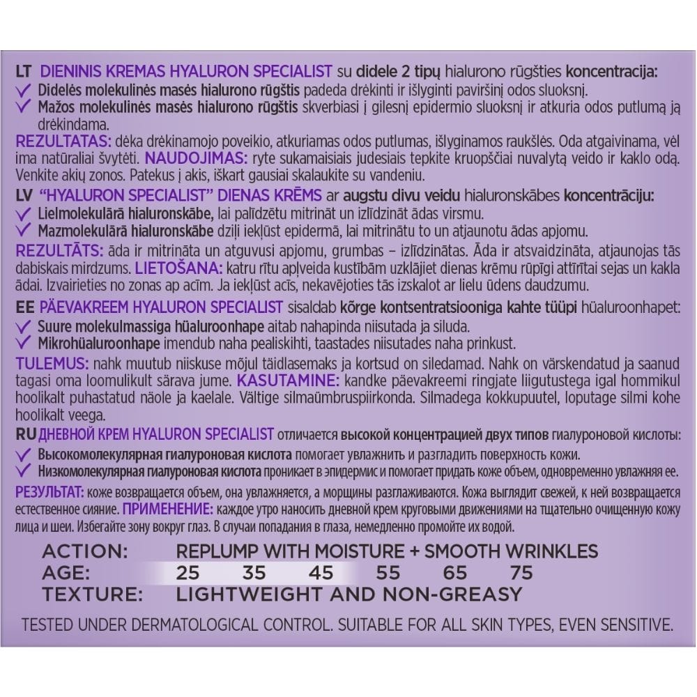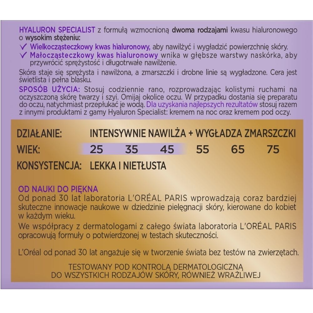Hyaluron Especialista crema hidratante de día es un producto innovador desarrollado por los Laboratorios L'Oréal Paris como parte de su cuidado hidratante reparador. Responde a las necesidades de las mujeres que desean mantener su piel joven y fresca, combatiendo eficazmente los primeros signos del envejecimiento y protegiéndola de los rayos nocivos del sol.