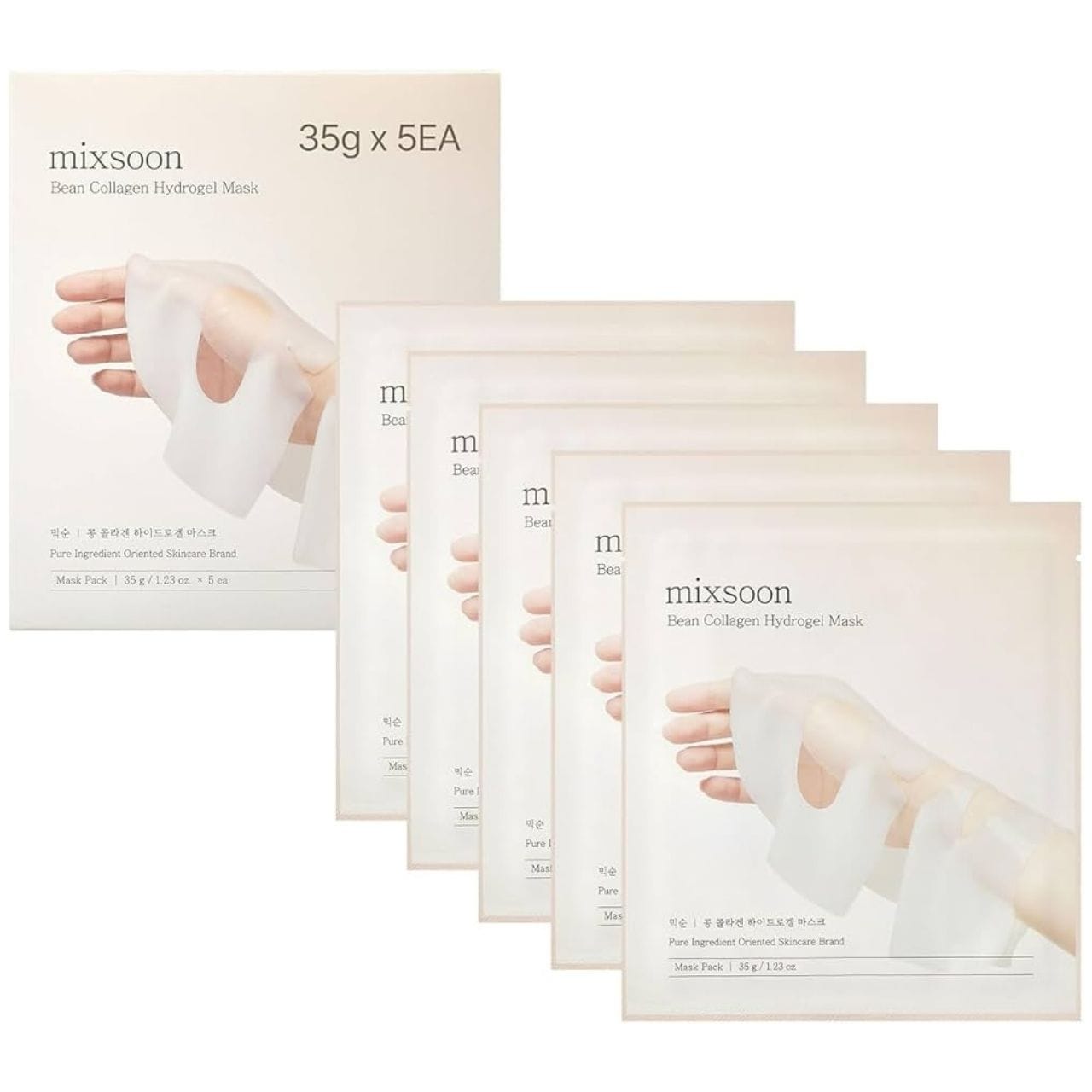 Mixsoon Bean Collagen son mascarillas de hidrogel con extractos fermentados de soja, cebada, pera y granada, y colágeno vegetal. Hidratan intensamente, suavizan y restauran la luminosidad de la piel.