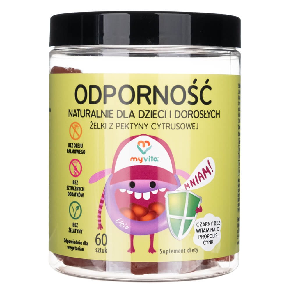MytVita Immunity es un complemento alimenticio en forma de geles naturales de pectina de cítricos, adecuados para niños y adultos. Los ingredientes naturales que contienen los geles MyVita garantizan un sabor delicioso y una ración adecuada de vitaminas y otros nutrientes para favorecer el buen funcionamiento del organismo. Los geles contienen una innovadora mezcla Immuno Protect compuesta por extracto de saúco, propóleo, zinc y vitamina C.