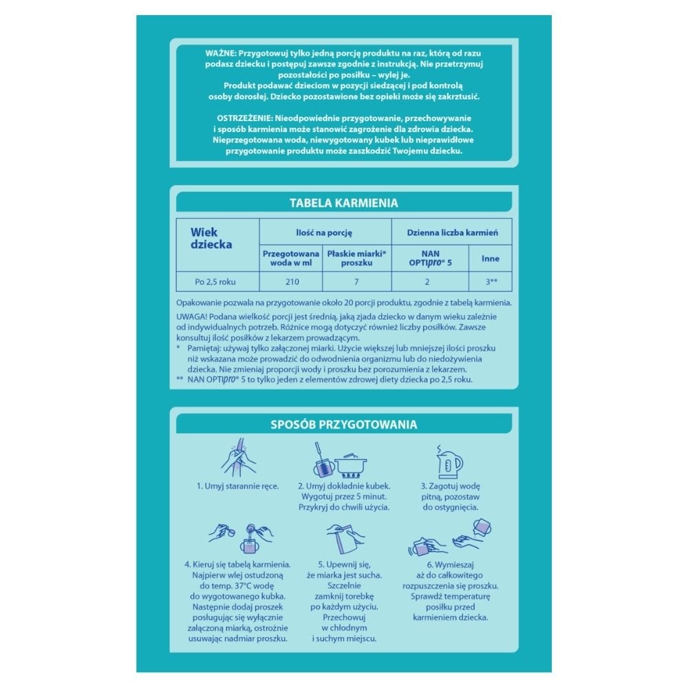 Nestlé NAN OPTIpro 5 es un producto lácteo destinado a niños pequeños mayores de 2,5 años. Enriquecido con vitaminas y minerales. No sustituye a la leche materna, sino que es un producto diseñado para facilitar la composición adecuada de la dieta de un niño.