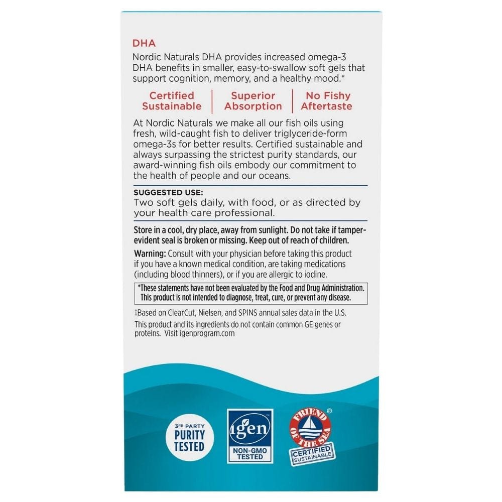 Nordic Naturals DHA es un complemento alimenticio en cápsulas de gel. La fórmula proporciona 830 mg de omega-3 , incluyendo hasta 480 mg de DHA (ácido docosahexaenoico).