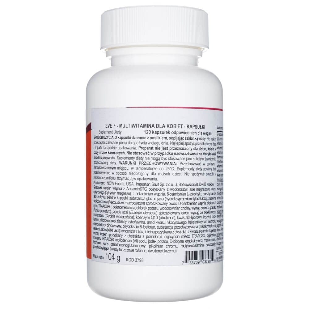 Now Foods EVE es un complemento alimenticio completo para mujeres en cápsulas blandas , que contiene vitaminas A , C , D , E , K , un espectro completo de vitaminas del grupo B y minerales en formas biodisponibles ( zinc , selenio , magnesio , hierro ) . La fórmula está enriquecida con extractos de plantas ( onagra , arándano , té verde ) y coenzima Q10. Las vitaminas C , E y el selenio contribuyen a proteger las células del estrés oxidativo . Las vitaminas B ayudan a reducir la sensación de fatiga. No contiene: gluten , trigo , OMG.