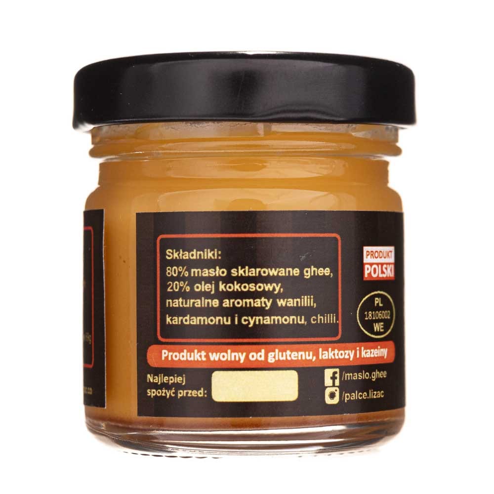 80% mantequilla ghee clarificada,20% aceite de coco, aromas naturales de vainilla, cardamomo y canelaon, guindilla.