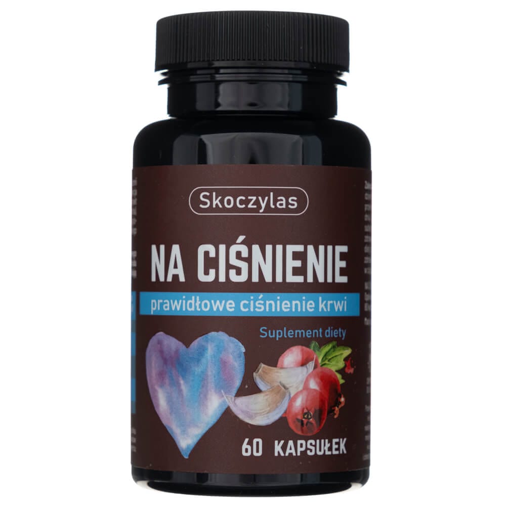El suplemento dietético Na Ciśnienie marca Skoczylas contiene potasio, que ayuda a mantener una presión arterial normal. Espino, que apoya la función del corazón y el sistema cardiovascular. Aronia y ajo, que tienen propiedades antioxidantes.