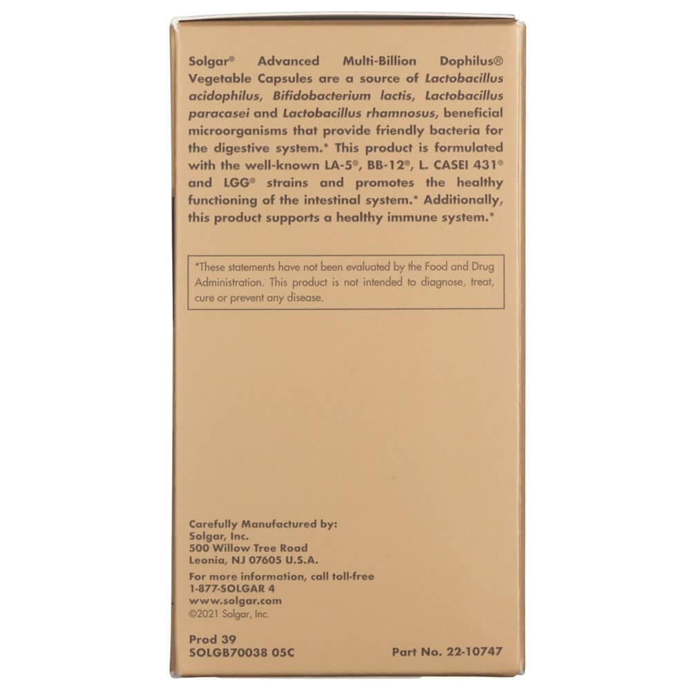 Solgar ® Advanced Multi-Billion Dophilus ® Cápsulas vegetales son una fuente de Lactobacillus acidophilus, Bifidobacterium lactis, Lactobacillus paracasei y Lactobacillus rhamnosus, microorganismos beneficiosos que proporcionan bacterias amistosas para el sistema digestivo. Este producto está formulado con las conocidas cepas LA-5 ®, BB-12 ®, L. CASEI 431 ® y LGG ® y promueve el funcionamiento saludable del sistema intestinal. Además, este producto apoya un sistema inmunológico saludable.