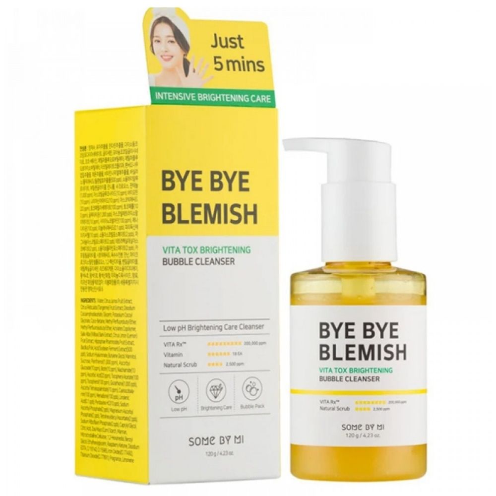Some by Mi Bye Bye Blemish Vita Tox Brightening Bubble Cleanser es una innovadora espuma limpiadora con un complejo de 18 vitaminas. La fórmula con burbujas de hidrógeno limpia suavemente e ilumina la piel, reduciendo la decoloración y dándole un brillo saludable.