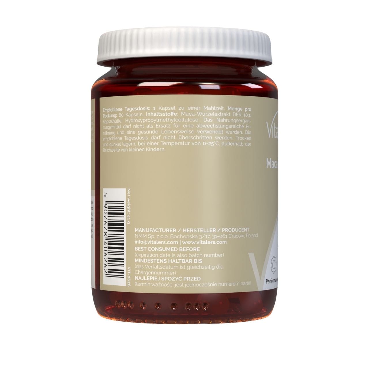 Standardized maca root extract 10:1; capsule shell (hydroxypropylmethylcellulose ).